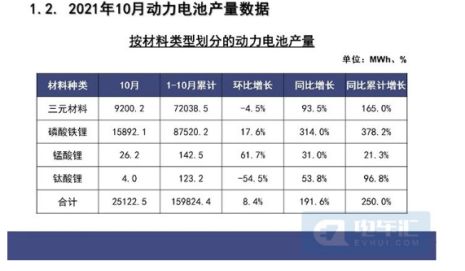 產(chǎn)量方面,2021年10月,我國動力電池產(chǎn)量共計(jì)25.1GWh,同比增長191.6%,環(huán)比增長8.4%。其中三元電池產(chǎn)量9.2GWh,占總產(chǎn)量36.6%,同比增長93.5%,環(huán)比下降4.5%;磷酸鐵鋰電池產(chǎn)量15.9GWh,占總產(chǎn)量63.3%,同比增長314.0%,環(huán)比增長17.6%。1-10月,我國動力電池產(chǎn)量累計(jì)159.8GWh,同比累計(jì)增長250.0%。其中三元電池產(chǎn)量累計(jì)72.0GWh,占總產(chǎn)量45.1%,同比累計(jì)增長165.0%;磷酸鐵鋰電池產(chǎn)量累計(jì)87.5Wh,占總產(chǎn)量54.8%,同比累計(jì)增長378.2%。
